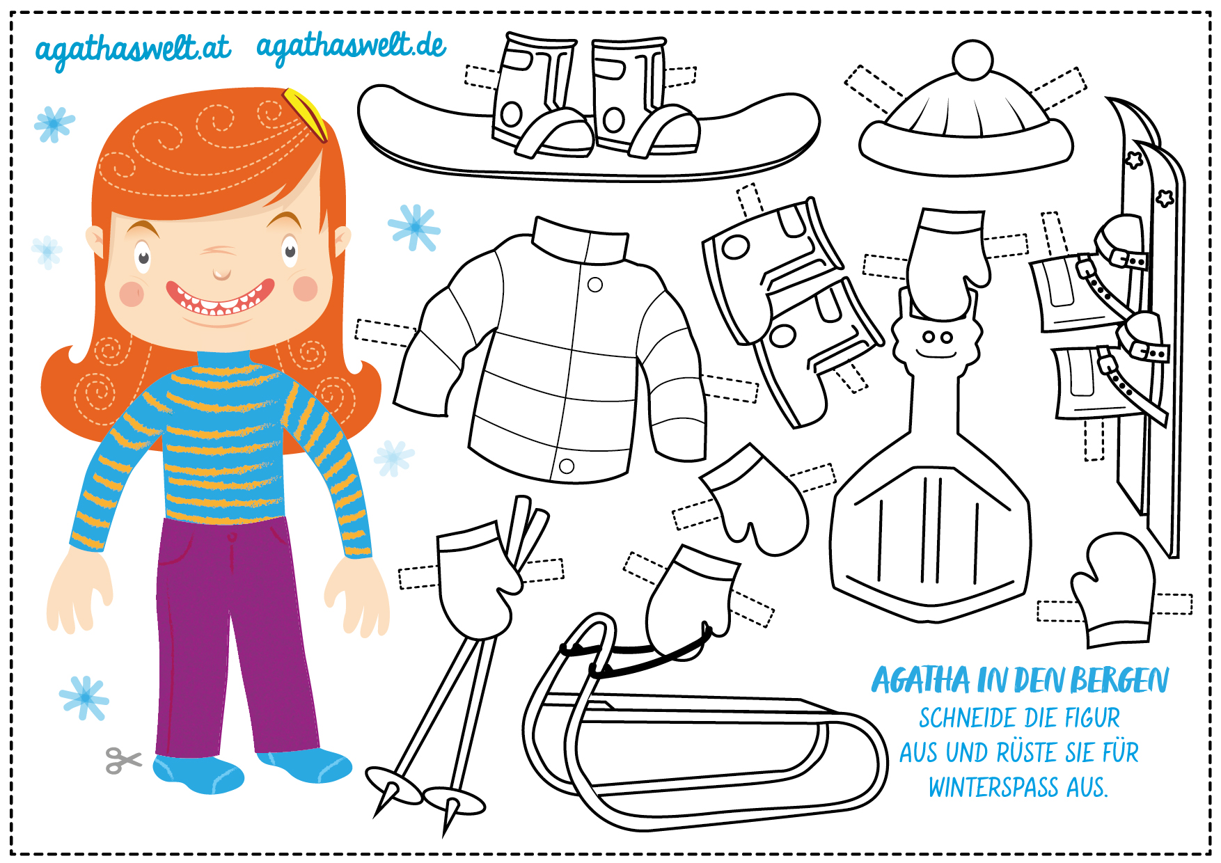 Laden Sie Agatha in den Bergen herunter, schneiden Sie sie aus und genießen Sie viel Spaß. Welche wird Ihre Favoritin sein? Agatha auf Skiern, auf einer Schaufel, auf einem Snowboard oder auf einem Schlitten?