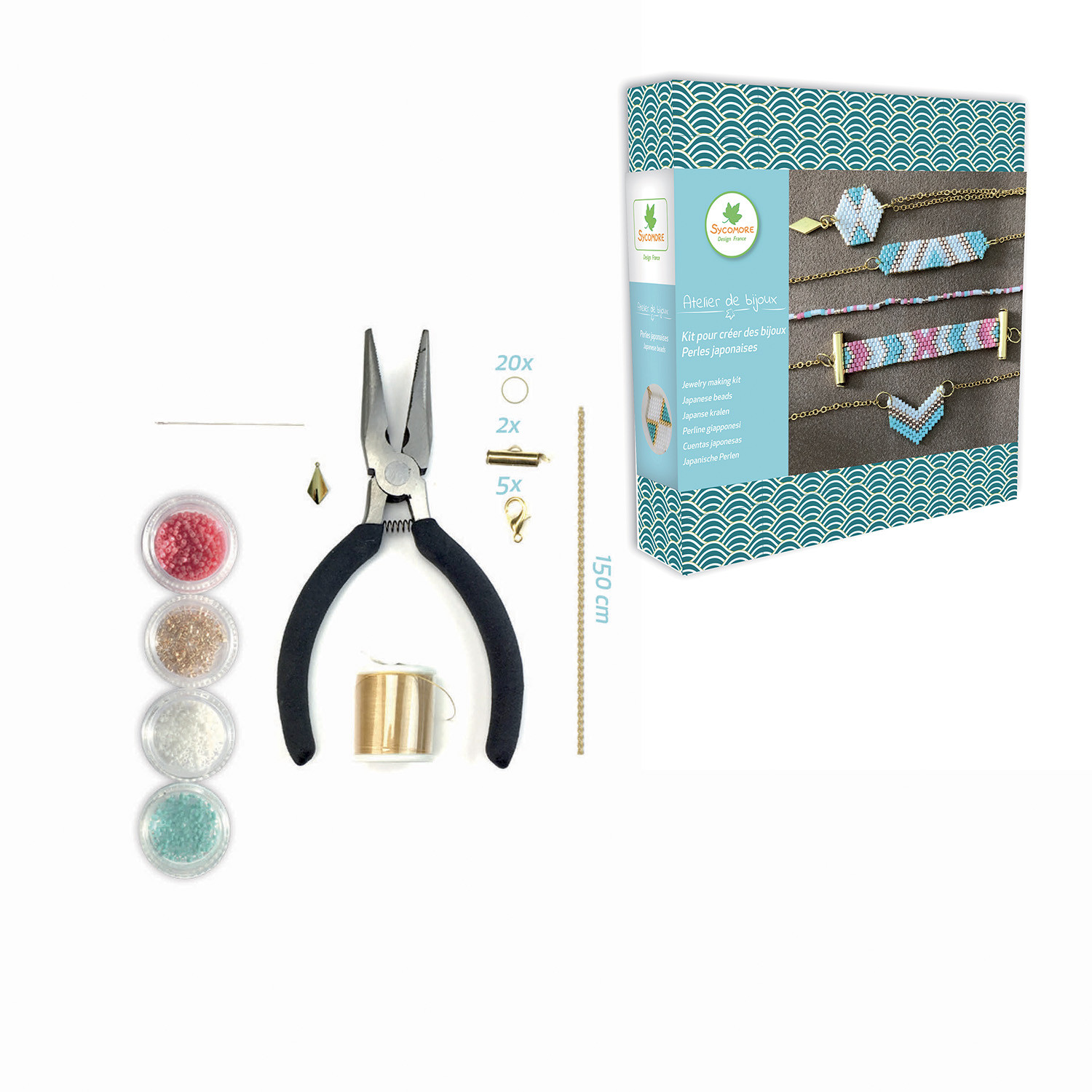 Die Box enthält: Japanische Perlen in einer Kunststoffbox (4 Farben), 20 Ringe, 6 m Nylonfaden in Goldfarbe, 5 Verschlüsse, 2 Verschlüsse speziell für japanische Perlen, eine Kette, 1 Anhänger, eine sehr dünne Nadel speziell für japanische Perlen, eine Schmuckzange und eine bebilderte Anleitung.